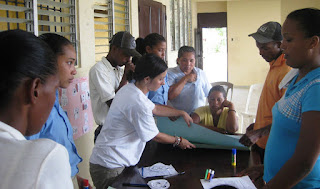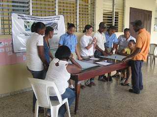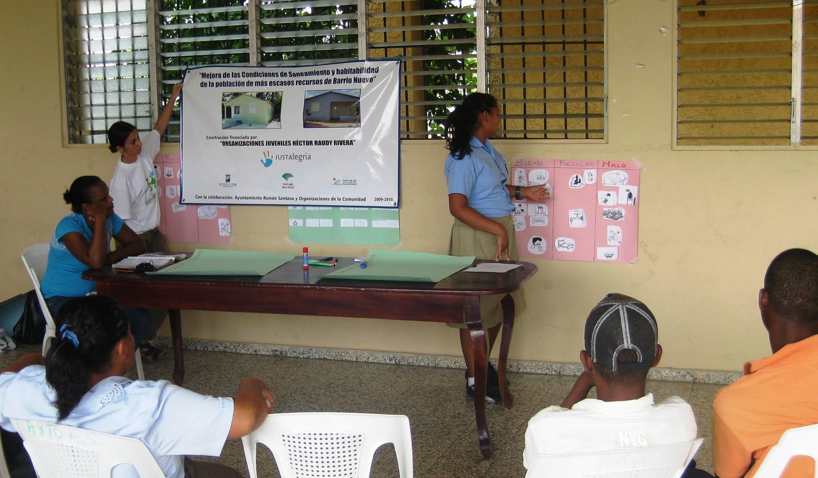 Algunos beneficiarios escuchando atentamente a la enfermera Paloma.Asistieron 6 de los 8 beneficiarios, todas unos beneficiarios escuchando atentamente a la enfermera Palomaellas mujeres, las máximas y casi únicas responsables en esta sociedad del cuidado del hogar y la familia. Contamos por segunda vez con la colaboración de Melvin Muñoz que será el responsable de realizar los siguientes ciclos de estos talleres con los demás grupos de beneficiarios del Proyecto.